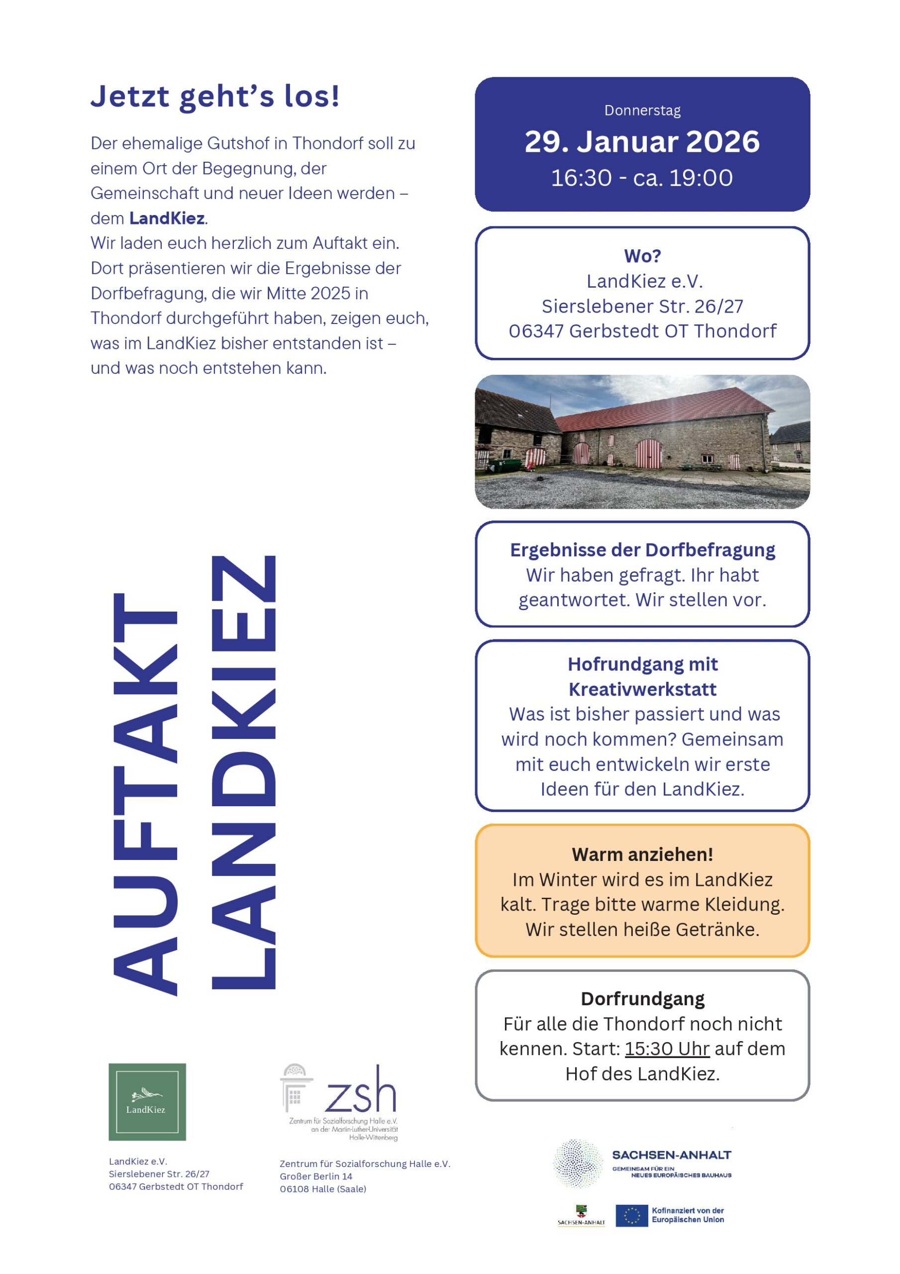 Jetzt geht’s los! Der Thondorfer LandKiez e. V. und das Zentrum für Sozialforschung Halle e. V. (ZSH) laden am Donnerstag, den 29. Januar 2026, auf den ehemaligen „Gutshof Weitzel“ zum „AUFTAKT LANDKIEZ“. Das Treffen ist eingebettet in ein NEB_ONTOUR und zugleich Start für die konkrete Arbeit an Zukunftsideen, die die Menschen im Dorf zusammengebracht hat: den einst landwirtschaftlich genutzten Hof in der Ortsmitte zu einem Ort der Begegnung, Gemeinschaft und neuer Möglichkeiten zu entwickeln.