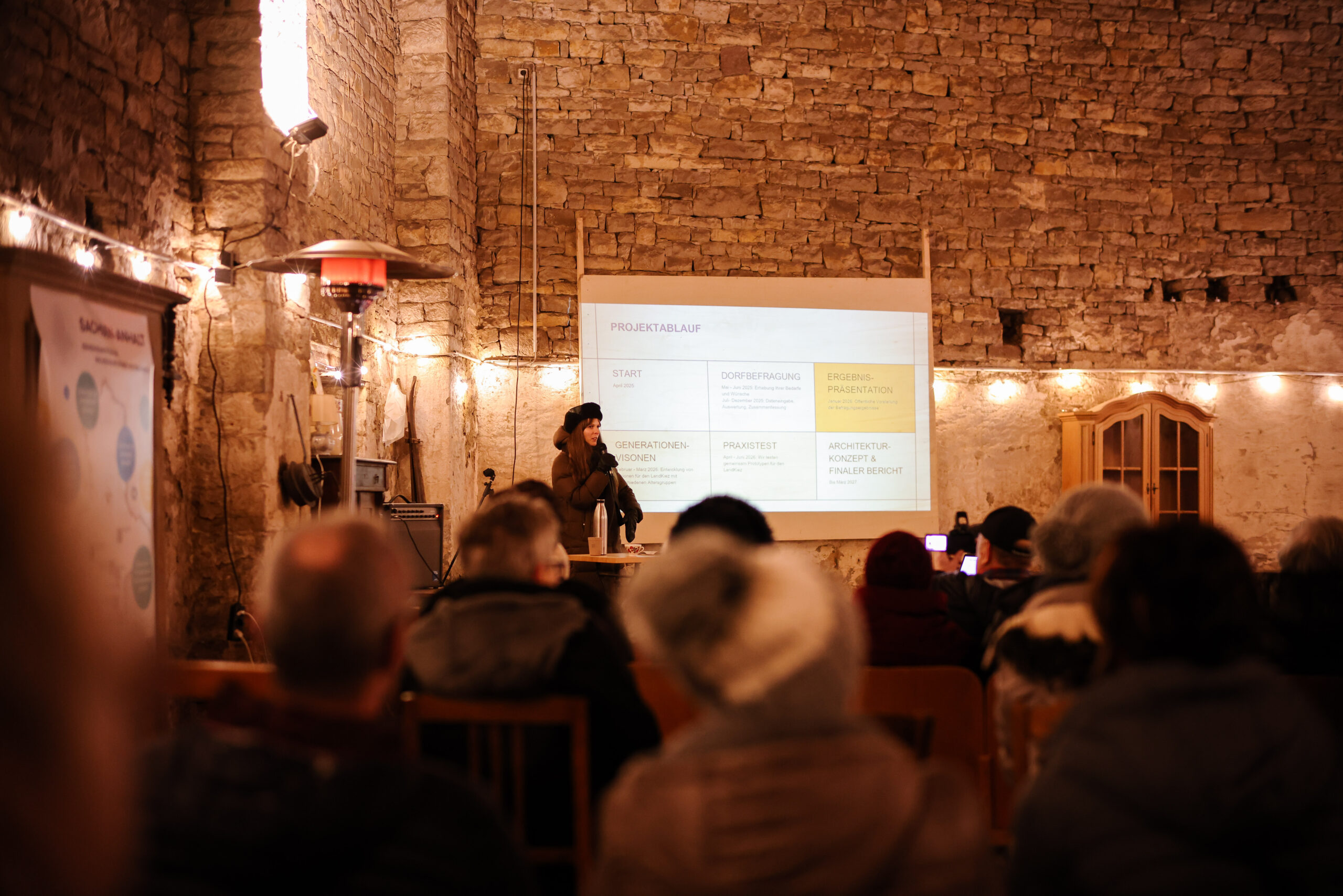 Während der winterliche Spaziergang insbesondere den Ortsfremden einen Eindruck vom Dorf, seiner Struktur und seinen gegenwärtigen Gegebenheiten vermittelte, schärfte sich dieses Bild während des Vortrags durch Isabel Müller vom ZSH zum Ergebnis der Dorfbefragung. Über die Hälfte der 109 Haushalte (52 %) hatten sich daran im Mai und Juni 2025 beteiligt. Im Fokus: lokale Bedarfe, dörfliche Identität und bestehende Netzwerke. Das Fazit: „Einerseits werden existierende Begegnungsorte wie der Schenkplatz sowie das hohe Maß an privatem und ehrenamtlichem Engagement zur Gestaltung und Pflege Thondorfs ausdrücklich positiv bewertet.“ Andererseits stehe der fortschreitende Verlust dörflicher Infrastruktur in der Kritik, insbesondere das Fehlen von Einkaufsmöglichkeiten, Gaststätten und weiteren sozialen Treffpunkten. Hoch aber sei der Stellenwert nachbarschaftlicher Verbundenheit und lokaler Zusammengehörigkeit und stark der ausgeprägte Wunsch nach der Wiederbelebung dörflicher Strukturen, die, so heißt es im Zwischenbericht „weniger an formale Verwaltungsprozesse als vielmehr an lokale Eigeninitiative und gemeinschaftliches Handeln geknüpft ist.“ Damit trifft der Verein LandKiez „auf ein soziales Umfeld, das partizipative, gemeinschaftsorientierte Begegnungsorte grundsätzlich unterstützt und aktiv mitgestalten möchte“, so Isabel Müller.
