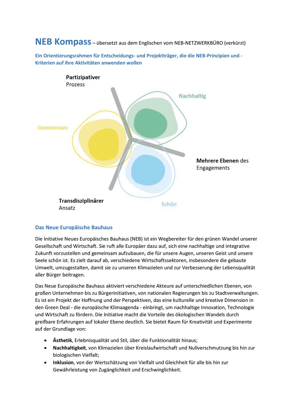 Der NEB-Kompass der EU Initiative zum Neuen Europäischen Bauhaus beschreibt die drei Kernwerte der Initiative und zeigt den Weg auf, wie ein Projekt zu einem “NEB-Projekt” werden kann. Um dies zu erreichen, legt der Kompass auch drei Arbeitsprinzipien fest, die für das gesamte Wertesystem gelten.